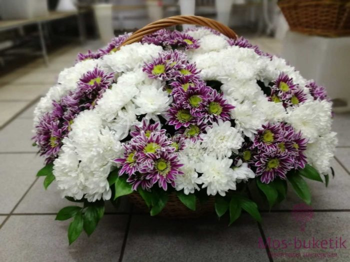 Состав:  Кустовые хризантемы — 51, Корзина — 1, Зелень, Флористическая губка.