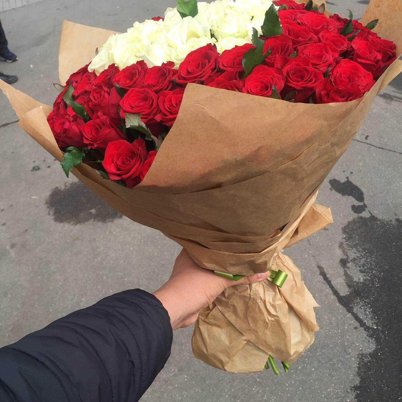 Состав: Розы — 101, Упаковка — 4, Лента — 1.