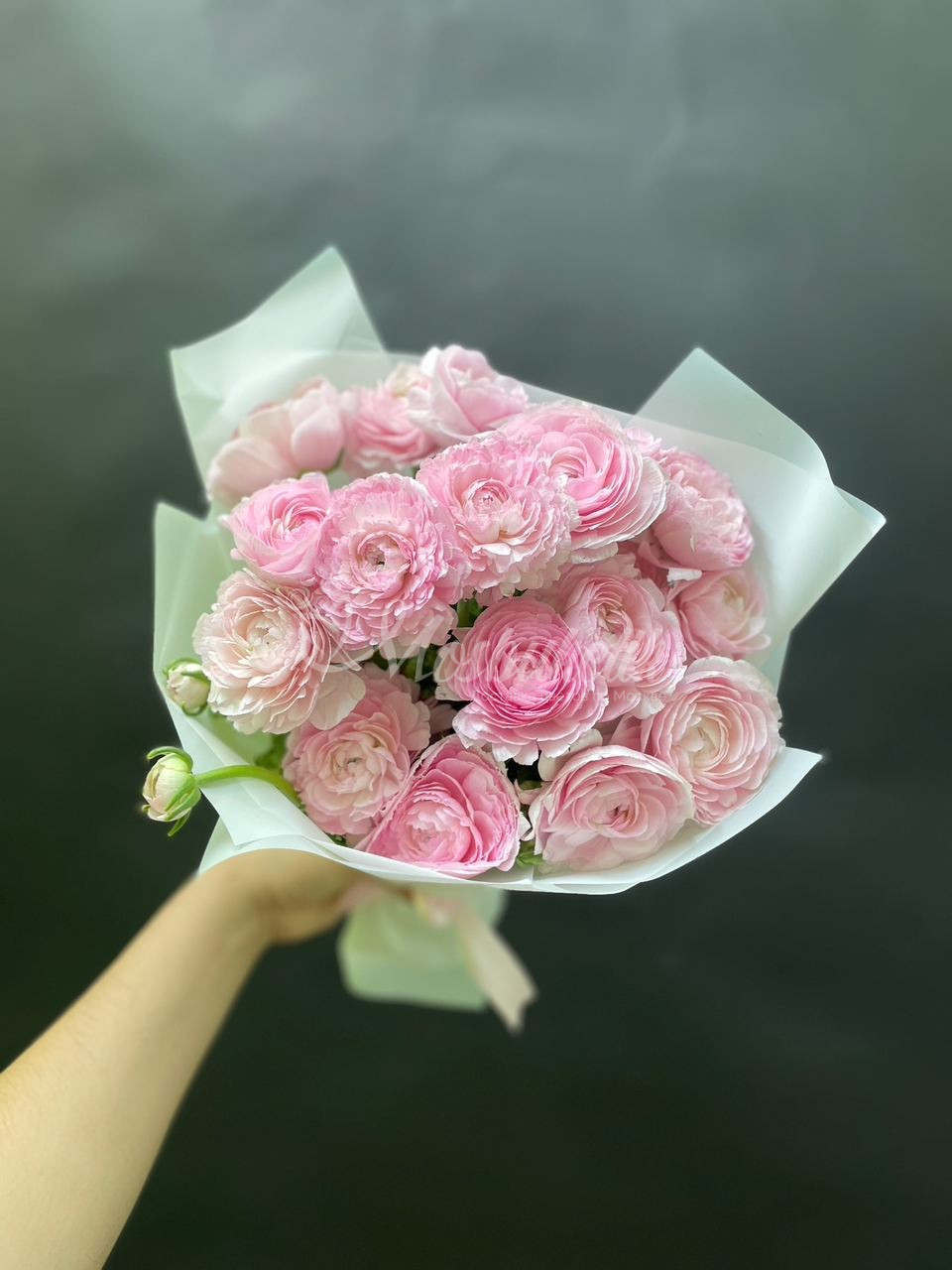 Букет из 15 ранункулюсов — это стильный и нежный подарок, который подойдёт для любого случая.