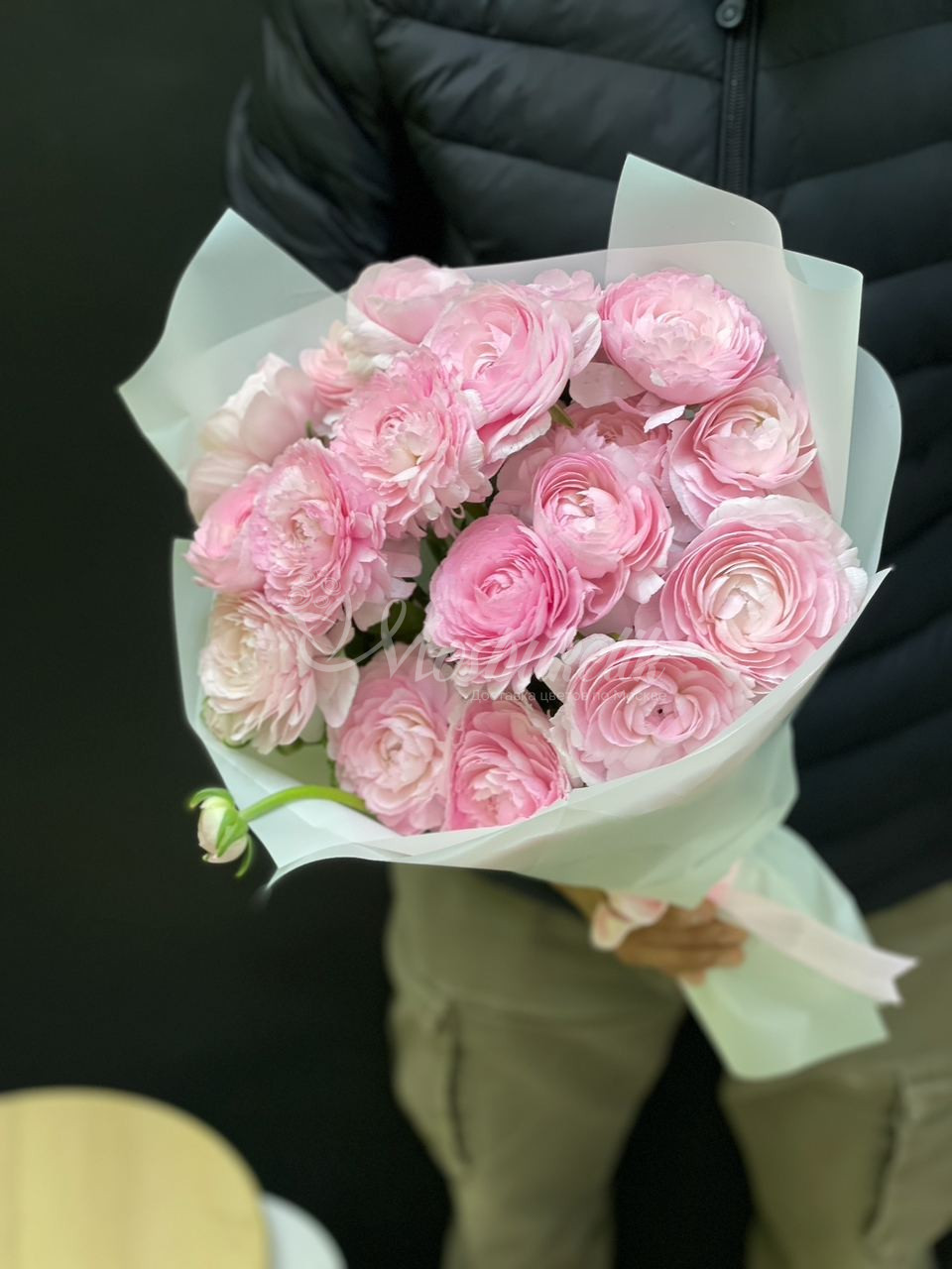Состав: Ранункулюс – 15, Упаковка — 2, Лента.