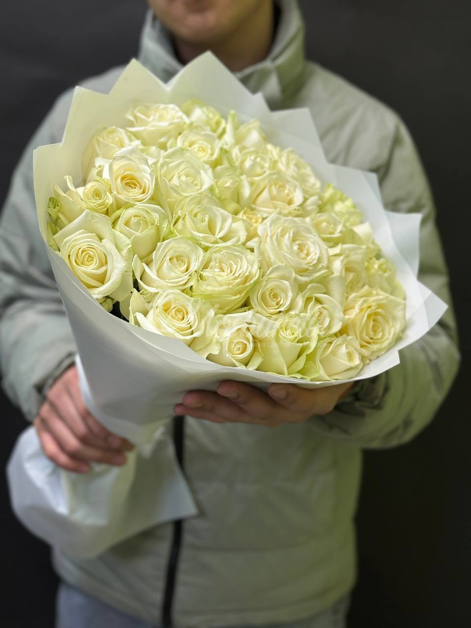 Состав:  Белые розы — 31, Упаковка — 2, Лента.