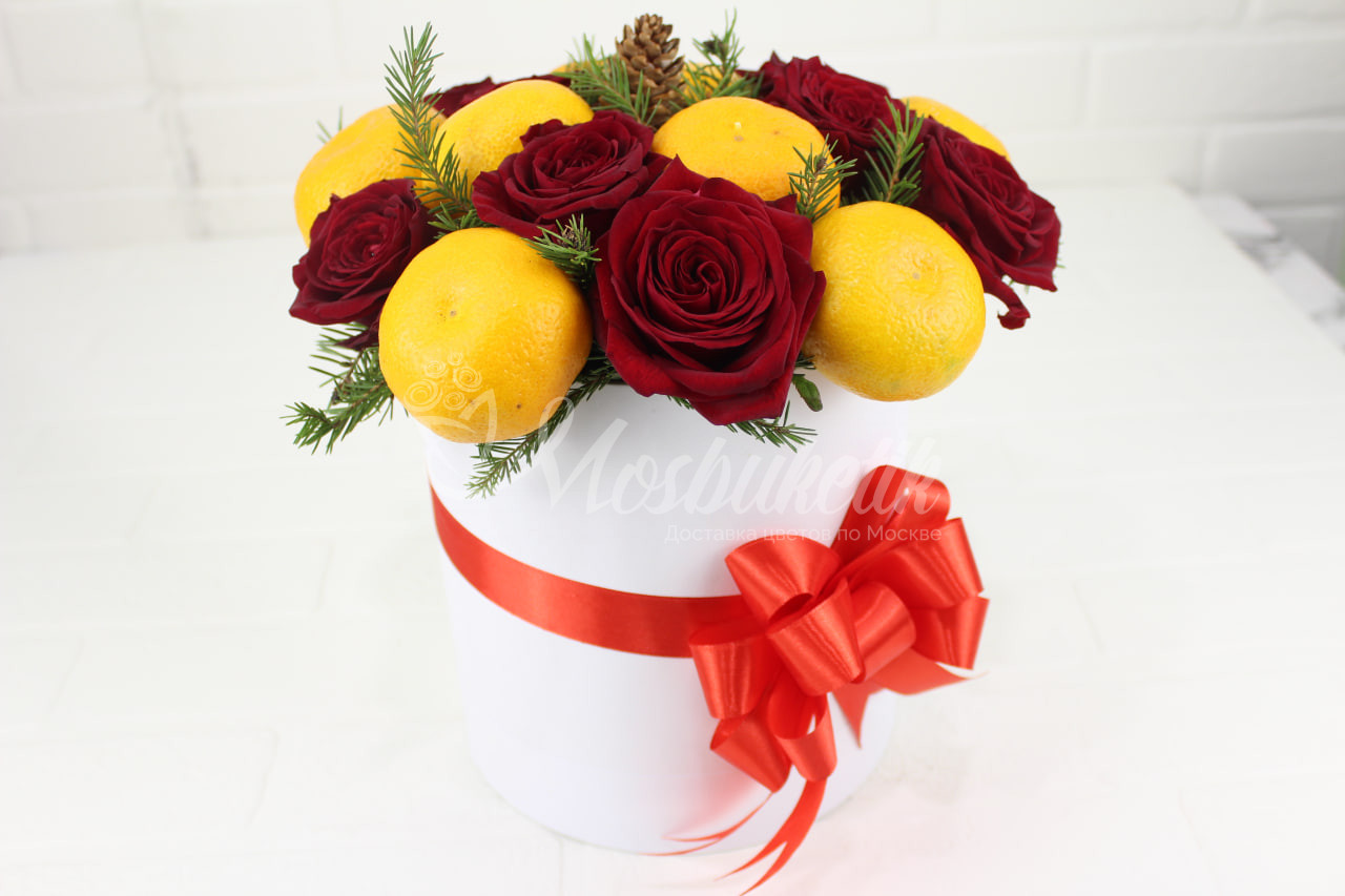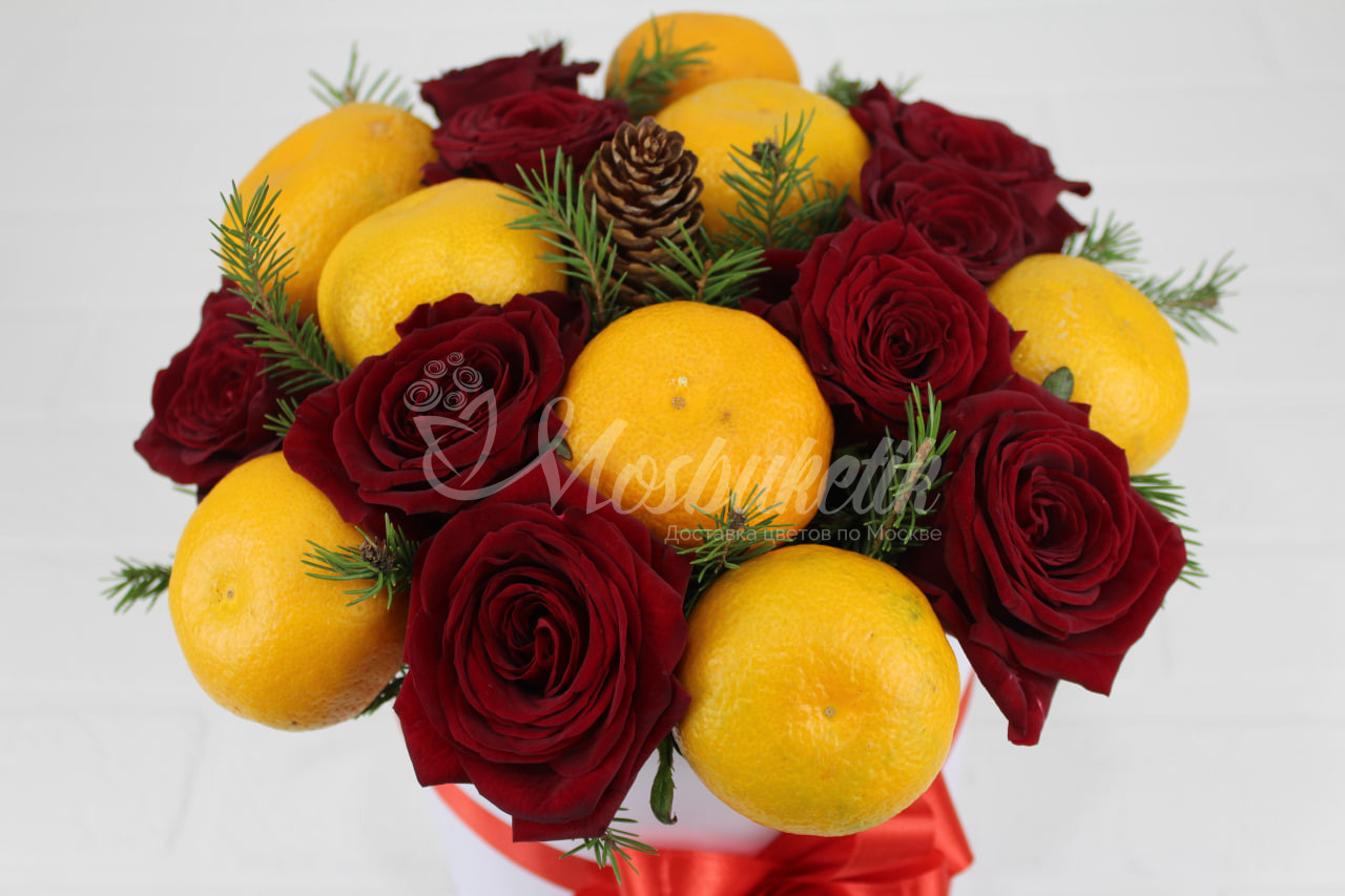 Состав: Мандарины — 7, Роза — 7, Коробка — 1, Губка — 1, Шишка — 1, Хвоя — 3, Лента.